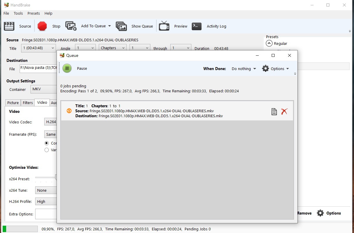 No meu pc qe tenho um ryzen 7 5700x e uma rtx 2060super, se o arquivo for em 1080p pra 720p e 43 minutos o tamanho do episodio, demora uns 5 a 7 minutos. agora se for 4k pra 1080p dependendo do tamanho em minutos do arquivo, demora uns 50 minutos.